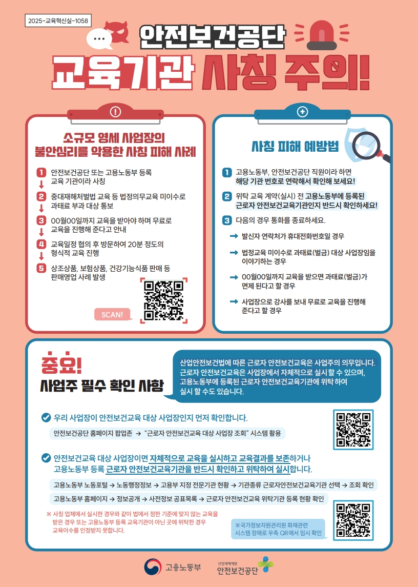 안전보건공단에서 제공하는 [안전보건교육기관 사칭 주의 안내] 리플릿을 게시하오니 업무에 참고하시기 바랍니다.