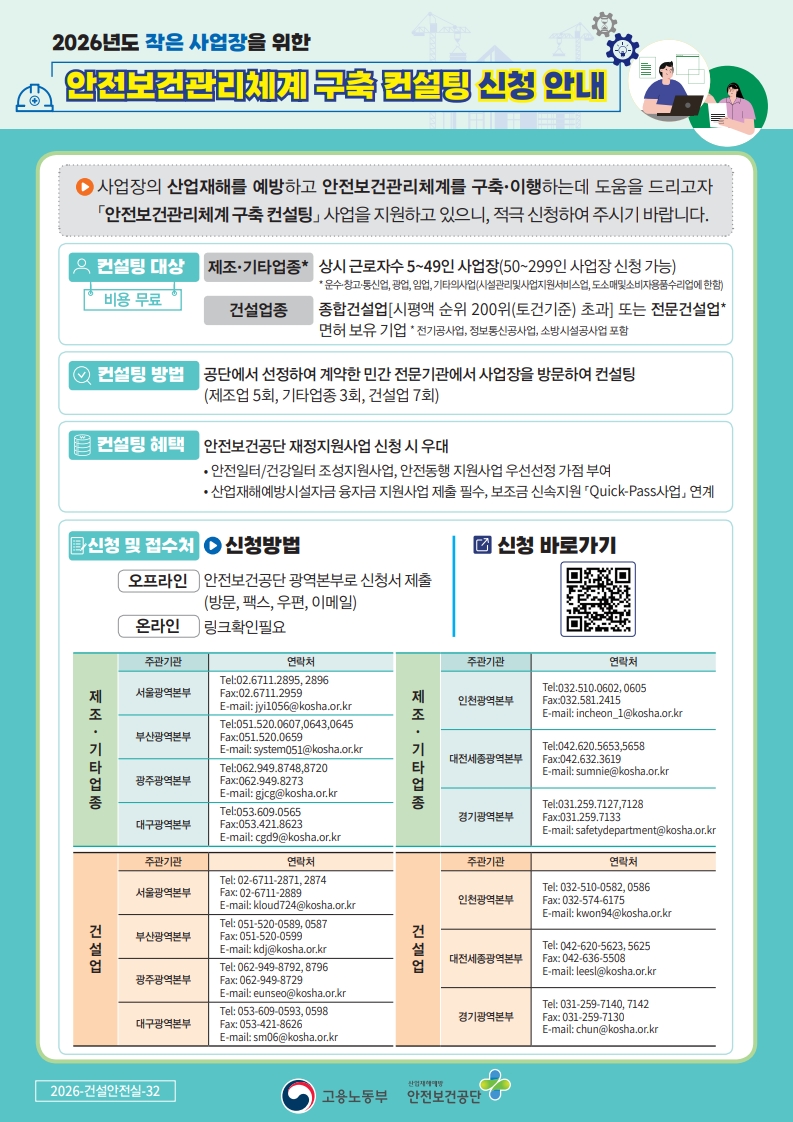 고용노동부 및 산업안전보건공단에서 사업장의 산업재해를 예방하기 위한 안전보건관리체계 구축 컨설팅 사업을 지원하고 있으니,